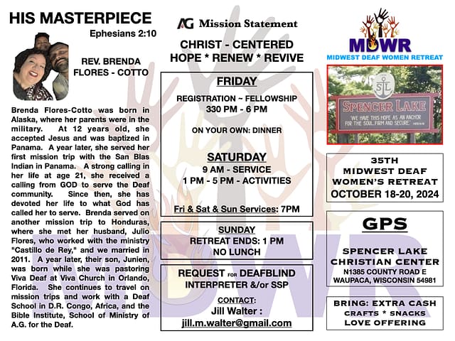 Uncategorized Midwest Deaf Women Retreat Flyer DLC March 24, 2024 0 Share this: Share on Facebook (Opens in new window) Facebook Share on X (Opens in new window) X About The Author DLC See author's posts Like this:Like Loading... Related Post navigation Previous: The Lindseys – Serving The Deaf of MexicoNext: North Central University! Leave a ReplyCancel reply Related Stories Uncategorized Mark A Pay On Line DLC September 24, 2025 0 Uncategorized DEAF BLACK FELLOWSHIP HOSTSTHANKSGIVING DINNER DLC October 11, 2024 0 Uncategorized THANKSGIVING POTLUCK DLC October 11, 2024 0