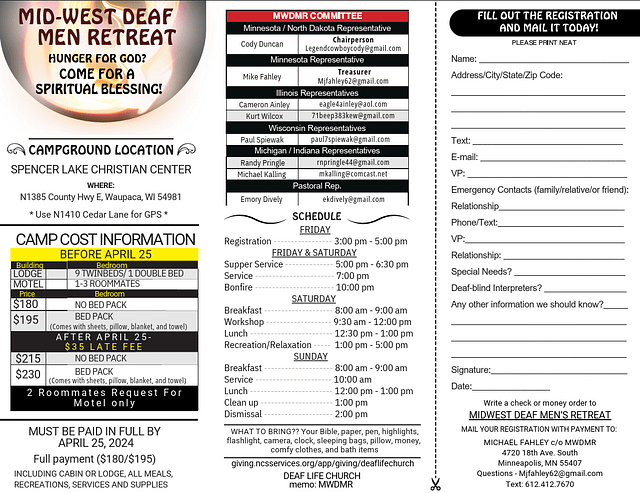 Uncategorized MID-WEST DEAFMEN RETREAT Flyer-Picture DLC April 3, 2024 1 minute read 0 Share this: Share on Facebook (Opens in new window) Facebook Share on X (Opens in new window) X Attachment PDF PrintableInformation Link: MID-WEST DEAFMEN RETREAT About The Author DLC See author's posts Like this:Like Loading... Related Post navigation Previous: Happy resurrection day! Here is Caleb Resch’s newsletter!Next: DWF Event Flyer-Picture Leave a ReplyCancel reply Related Stories Uncategorized Mark A Pay On Line DLC September 24, 2025 0 Uncategorized DEAF BLACK FELLOWSHIP HOSTSTHANKSGIVING DINNER DLC October 11, 2024 0 Uncategorized THANKSGIVING POTLUCK DLC October 11, 2024 0