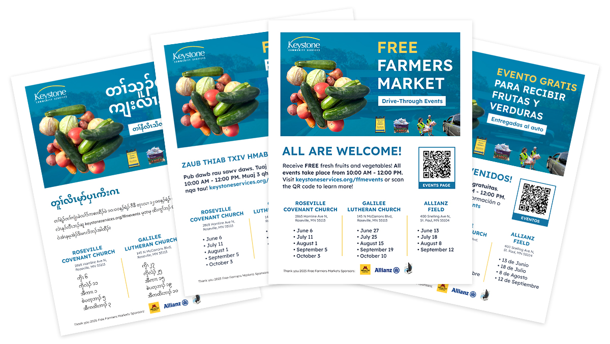Keystone’s 2025 Free Farmers Market Events are proudly sponsored by MHealth Fairview, Allianz, and Minnesota United FC.