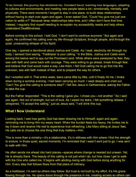 When God first called me to join this YWAM secondary school, nothing was in place. There were no interpreters. No co-navigators. No video relay interpreters. From a human perspective, it didn’t make sense. I couldn’t see how it would work—but I knew God had spoken. So I said yes, trusting He would take care of what I couldn’t yet see. I wasn’t the only one—Araya, the founder of Sonshine Interpreting, also sensed God’s leading and said yes to join me in His plan.