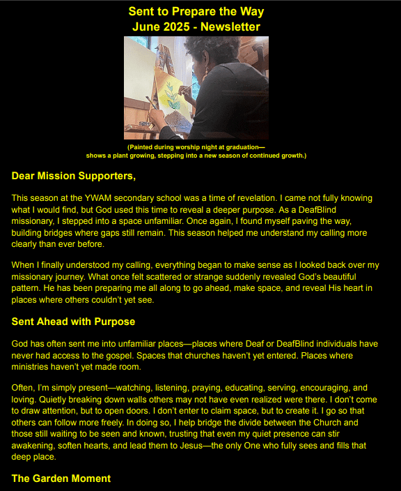 I’ve attached my June newsletter, Sent to Prepare the Way, sharing how God revealed my calling and continues to lead me one step at a time.