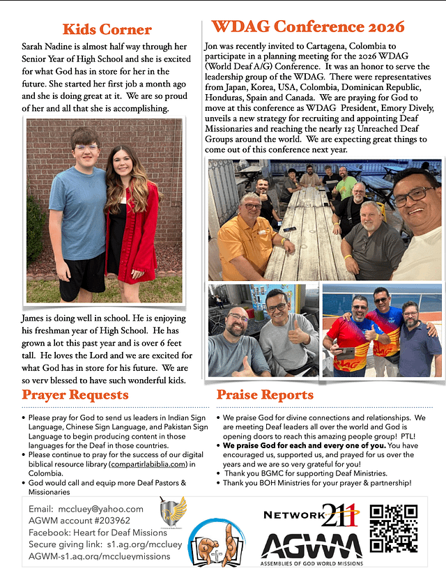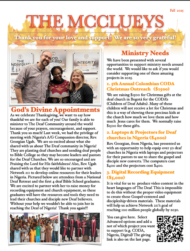 It is that time of the year for great food, family, and faith. Dede, Sarah Nadine, James, and I want to wish you a Happy Thanksgiving week. With it being Thanksgiving, we want to say thank you for your encouragement, love, and support. We are so honored to serve the Deaf community for Jesus and you make that possible. Your sacrifice allows us to tell people all over the world about the love of Jesus and grow His Kingdom. Thank you for your partnership and friendship! We have attached our latest newsletter to this email for you to read. We are so excited about the doors that God is opening and the connections we are making for deaf ministries around the world. Praying you have a wonderful week with family and friends. Thank you again for all you have done and continue to do for us! We love y’all!