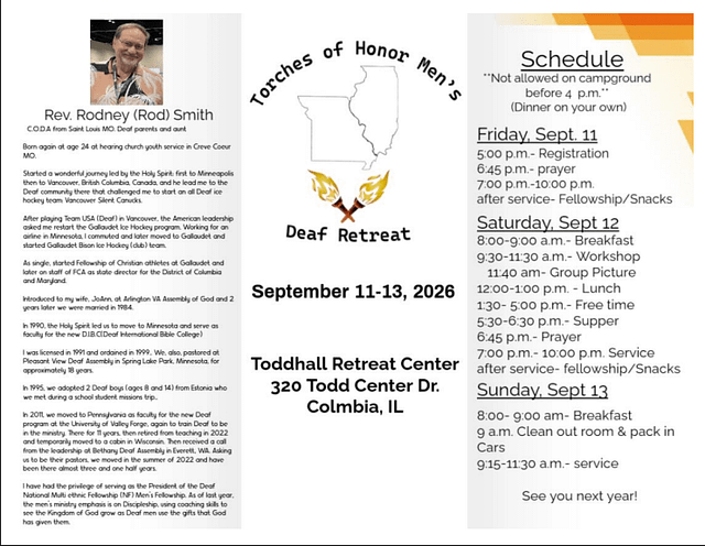 Flyer Deaf men retreat in Illinois Admin March 30, 2026 1 minute read 0 Share this: Share on Facebook (Opens in new window) Facebook Share on X (Opens in new window) X Deaf men retreat in Illinois PDF PrintablePDF Printable Download About The Author Admin See author's posts Like this:Like Loading... Related Post navigation Previous: 2026.03.30 DLC Weekly News Leave a ReplyCancel reply Related Stories Flyer Celebrating The Life Of Christopher Pangelinan Admin March 28, 2026 0 Flyer Reminder Deaf Women Fellowship of MN – 36th Annual Event – Saturday, May 30, 2026 Admin March 25, 2026 0 Flyer Deaf Holy Spirit Conferences’s Post Admin March 18, 2026 0